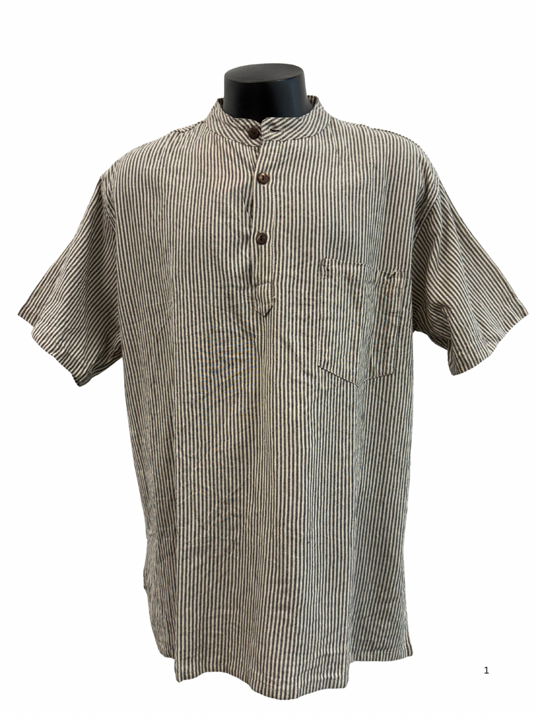 Short sleeved black / white striped cotton shirt featuring three button closure, chest pocket, side pocket and side splits.
