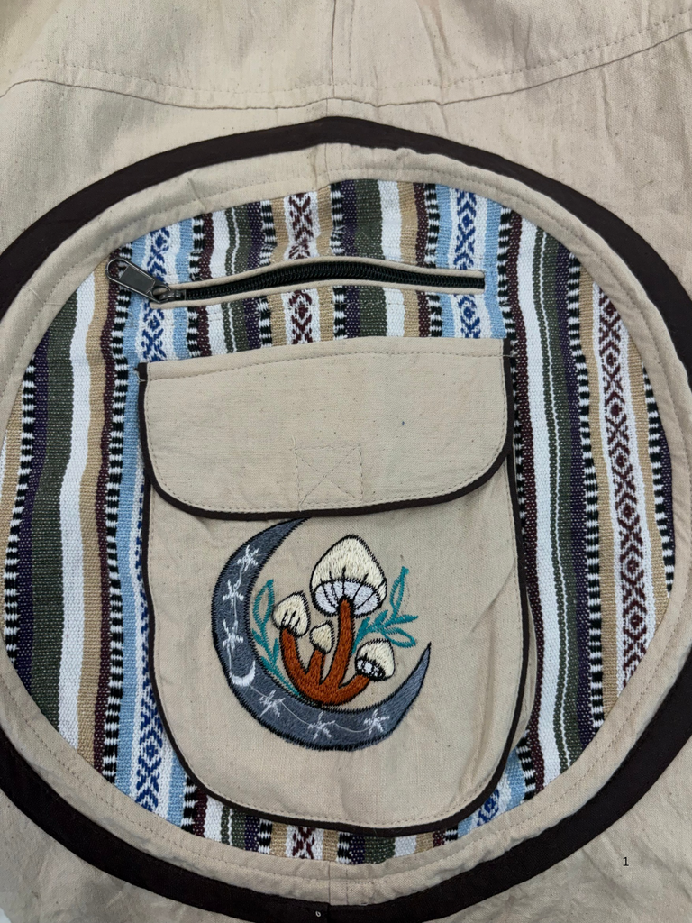 Cotton shorts featuring gheri fabric inlaid circles with mushroom embroidery on leg pockets.