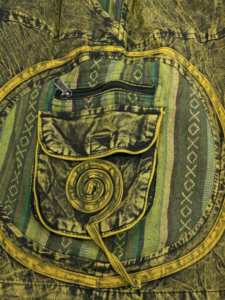 Stonewashed Cotton shorts featuring gheri panels with elasticised and drawstring waist. There are pockets on hips and outside legs with zippered and Velcro closure and spiral appliqué on leg pocket.