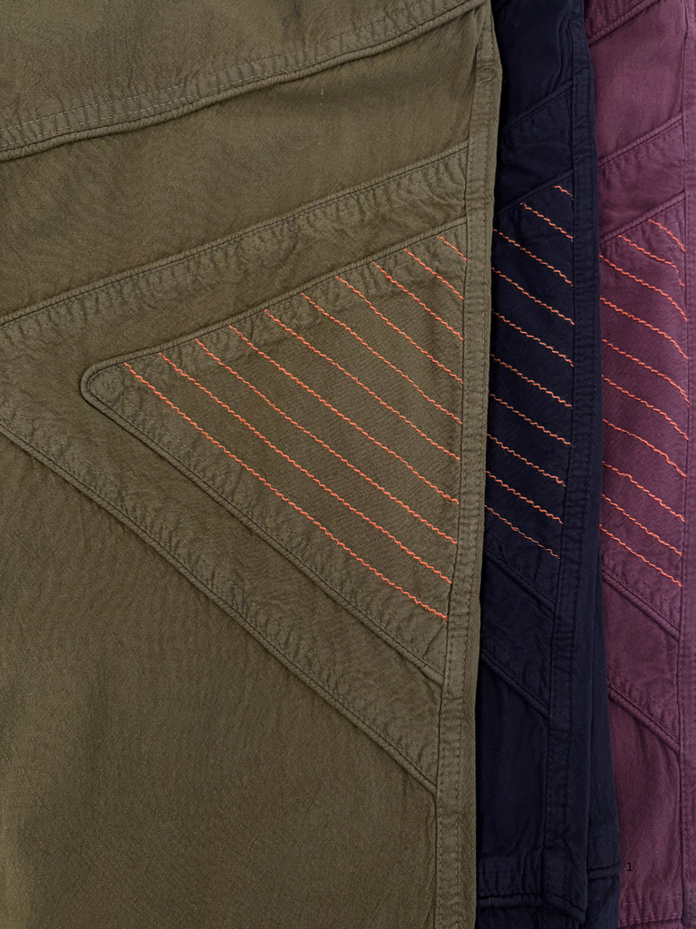 Mid weight cotton pants with asymmetric piped and contrast stitched appliqué detail on leg, elasticised and drawstring waist, elasticised cuffs, side pockets.